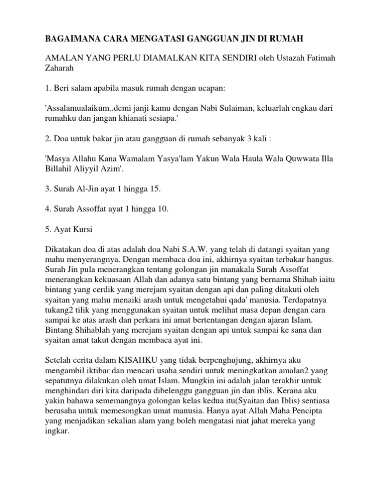 Makhluk yang bernama JIN memang wujud sebab dah disebut dalam al-Quran dan hadis Nabi. Cara menghilangkan gangguan jin di rumah 1. Sebab jin jahat akan takut mendekati atau menggangu orang yang dekat dengan pencipta-Nya.